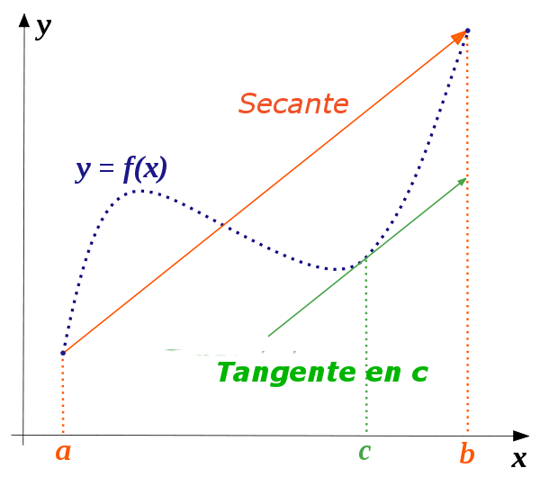 El teorema dice que dada cualquier función f continua en el intervalo [a, b] y derivable en el intervalo abierto (a, b), entonces existe al menos algún punto c en el intervalo (a, b) tal que la tangente a la curva en c es paralela a la recta secante que une los puntos (b, f(b)) y (a, f(a)). Es decir:
