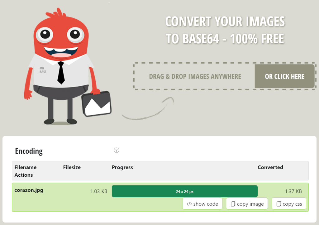 Sitio https://www.base64-image.de/ para convertir una imagen a base64.