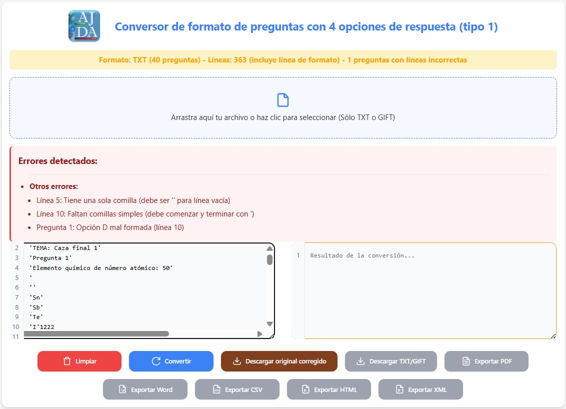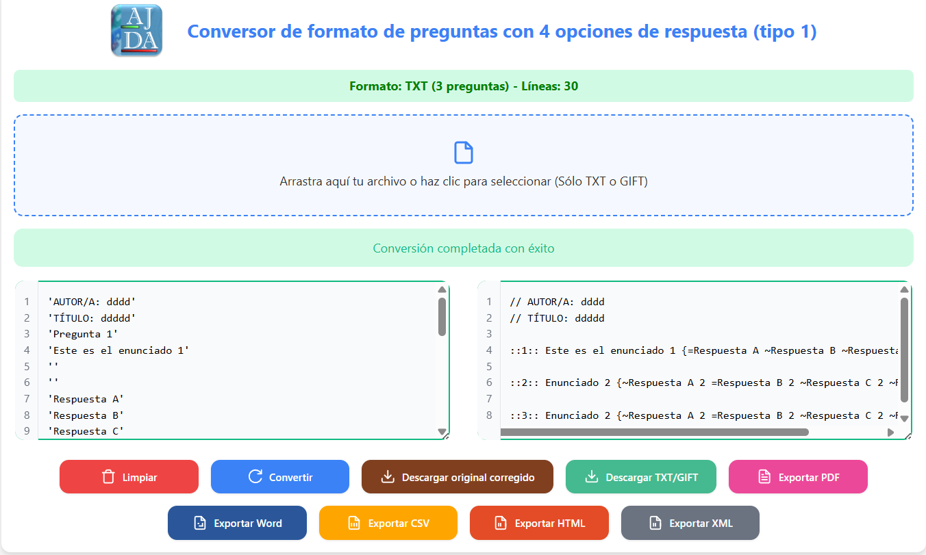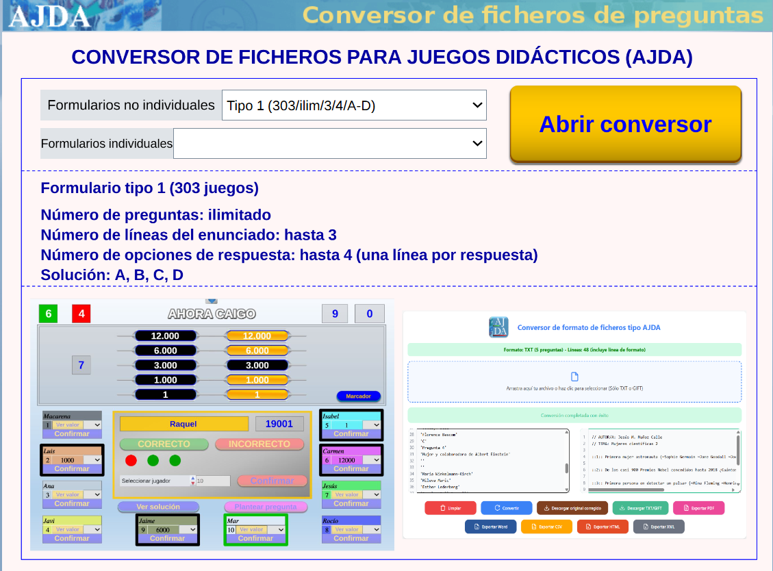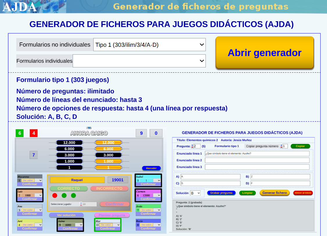 • Generador de preguntas. El Proyecto AJDA dispone de un generador de preguntas para sus juegos que permite crear y secuenciar las cuestiones planteadas acordes con el nivel del alumnado al que van dirigidas. Además, los ficheros de preguntas generados pueden ser archivados y clasificados en el repositorio del Proyecto AJDA.